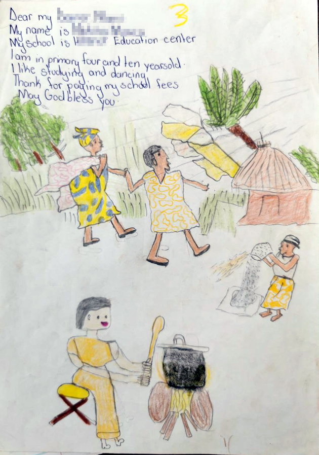 Die Zeichnungen aus Afrika sind ein Ausdruck von Dankbarkeit und Wertschätzung von den Kindern. Mit viel Kreativität und Freude haben die Kinder kleine Kunstwerke gestaltet, um ihren Pat:innen „Danke“ zu sagen.